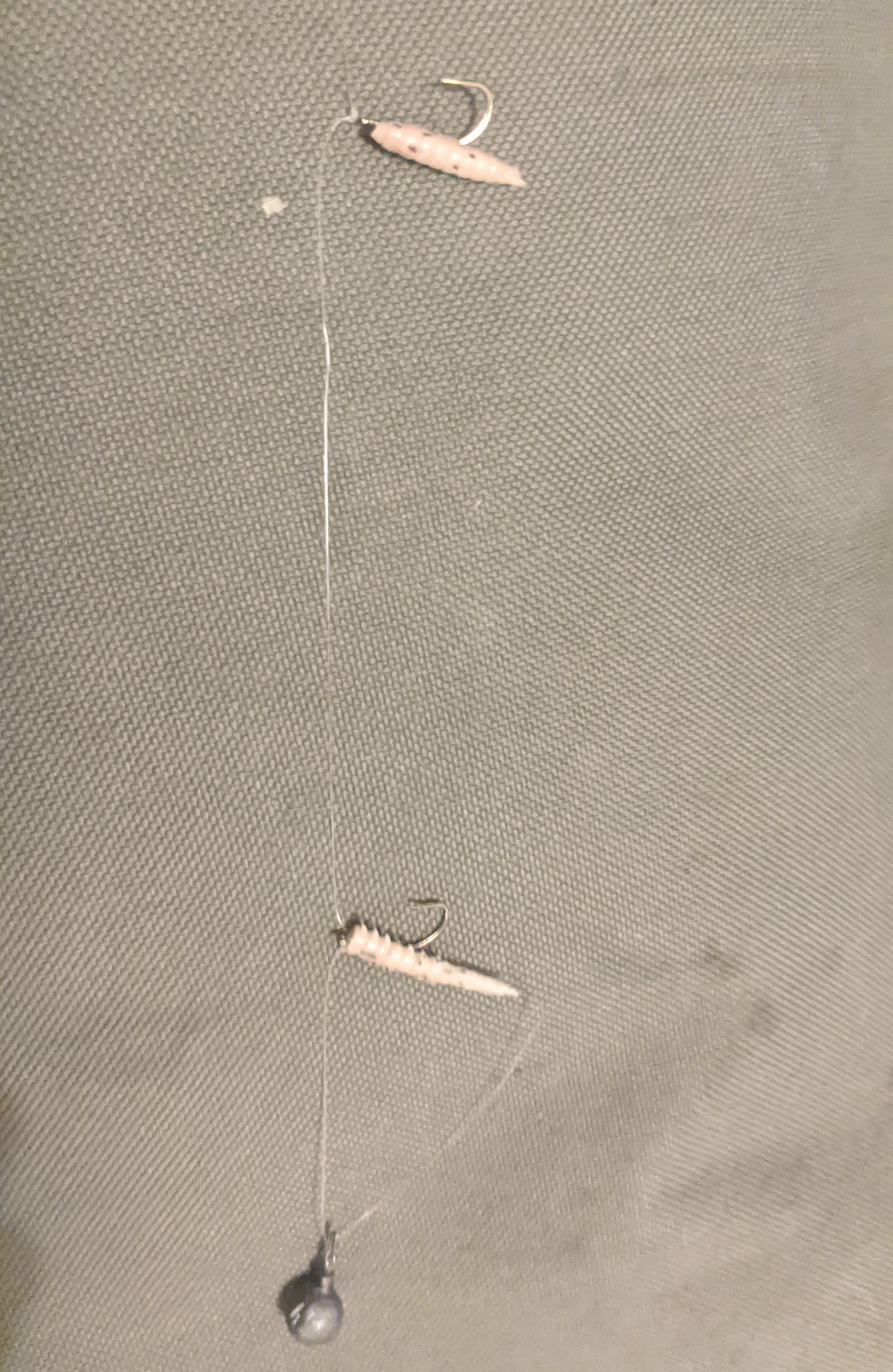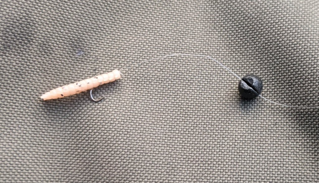 A small split shot weight, with a size 12 hook and a small section of isome worm. I will cast out and slowly twitch and retrieve.